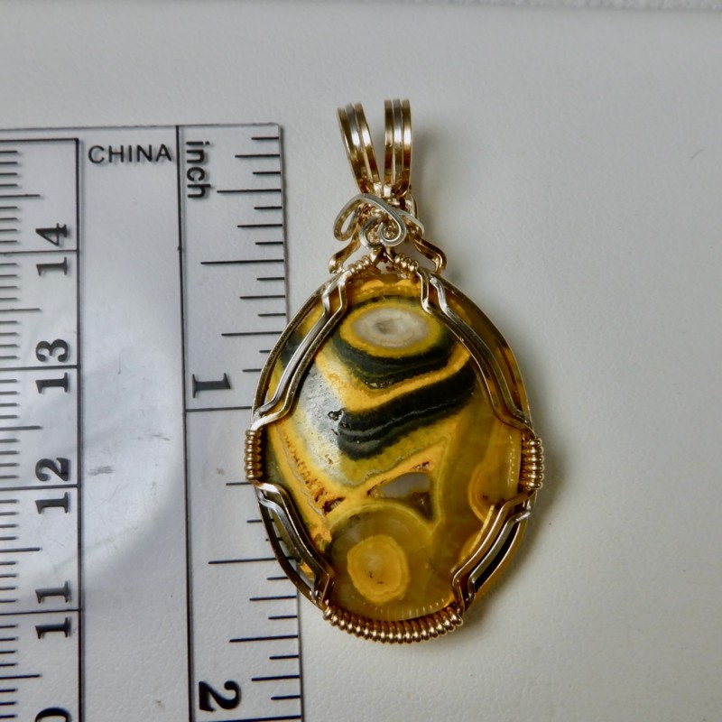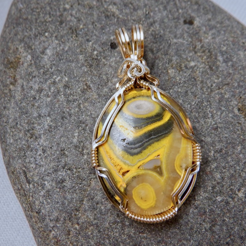 Your pendant is elegantly wire wrapped in high quality Argentium and 14/20 yellow gold fill wires. Wire work is square gold fill, for a dignified look. If you enjoy the colors, the drama, and the pleasant contrast, you could have lots of fun with this pendant.