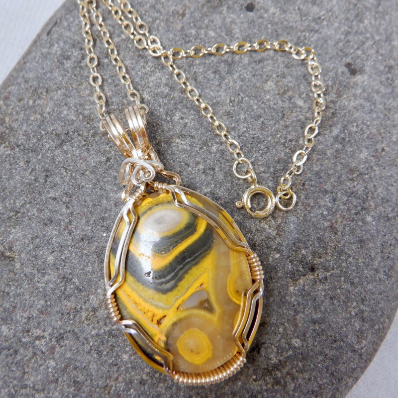 You'll have a blast showing off this brilliant pendant of unusual Bumblebee jasper. It's such a distinctive stone, not to be mistaken for anything else! This is some "older" stone, with great color contrasts. Much of what is being sold today has lots of grayish tones, but not this. This is great for anyone who loves to stand out from the crowd, as well as folks who love the bees.