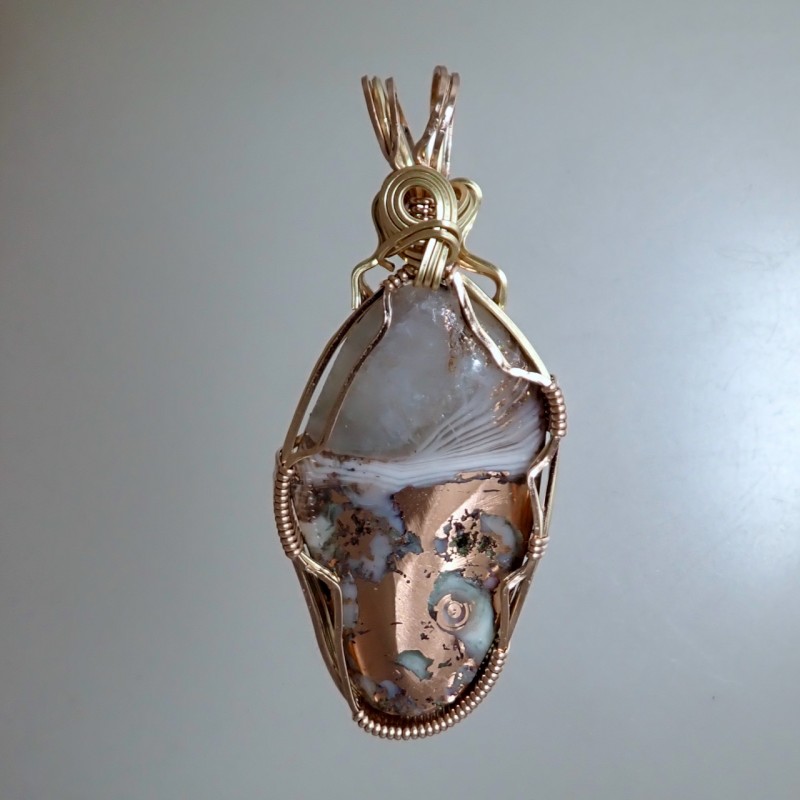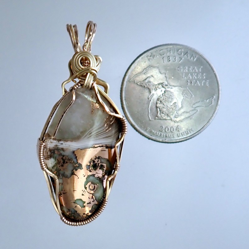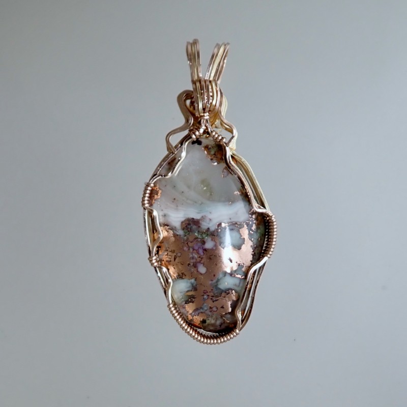 This stone is wrapped in pink and yellow gold with small Celtic-like swirls at the top, giving it a regal commanding look. The pink gold matches the copper of the agate. The yellow gold makes it royal looking. This could be worn with either a yellow or pink gold chain. See our Chain page for a selection. The back of this stone is polished and similar to the front, with lots of copper.