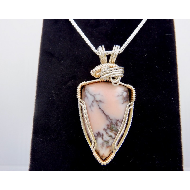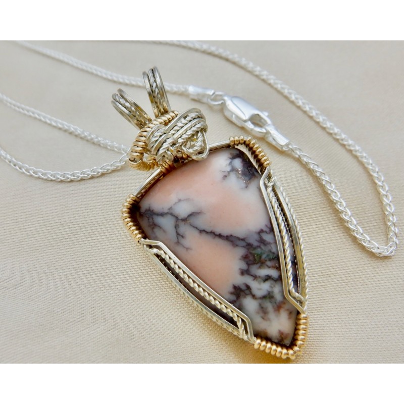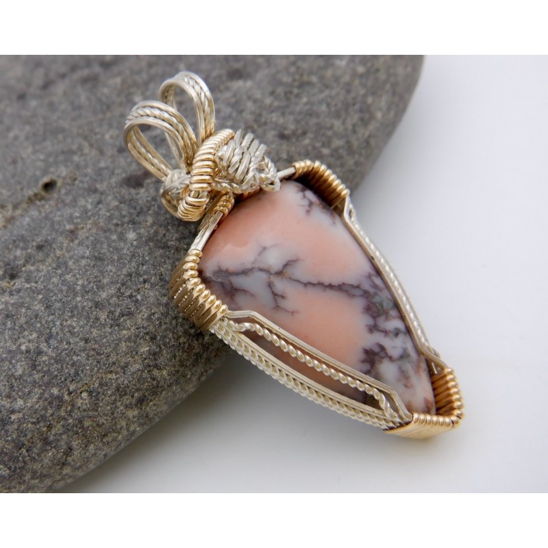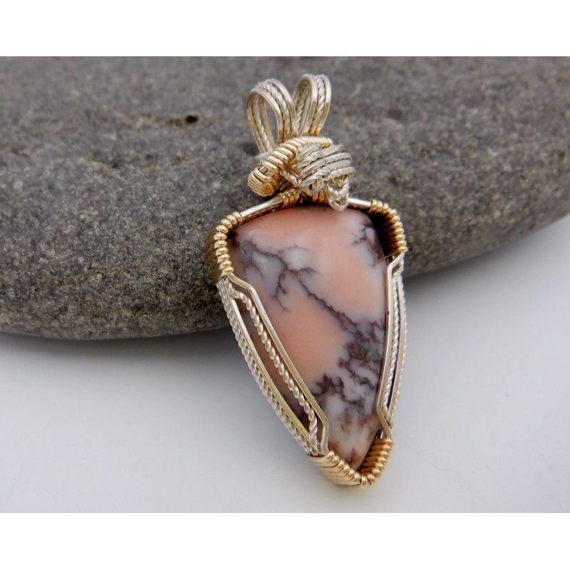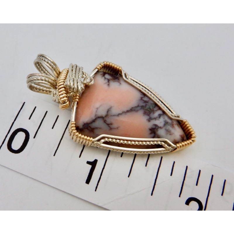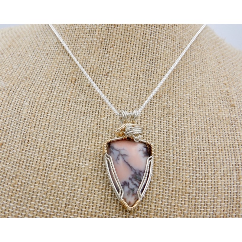 This Mesnard Mine Datolite is ridded with dark copper, you can see bits of the copper along the gray lines it forms. Wire wrapped in both Argentium silver and gold fill, the silver is twisted, adding a sparkle to the wires. Both colors of wire hug around the edge of the stone. Gold forms the wraps around the silver bundle, completed with beautiful side-to-side swirls at the top. This could be worn with either a silver or gold chain. Our chains are available at https://www.snobappealjewelry.com/store/17-chains