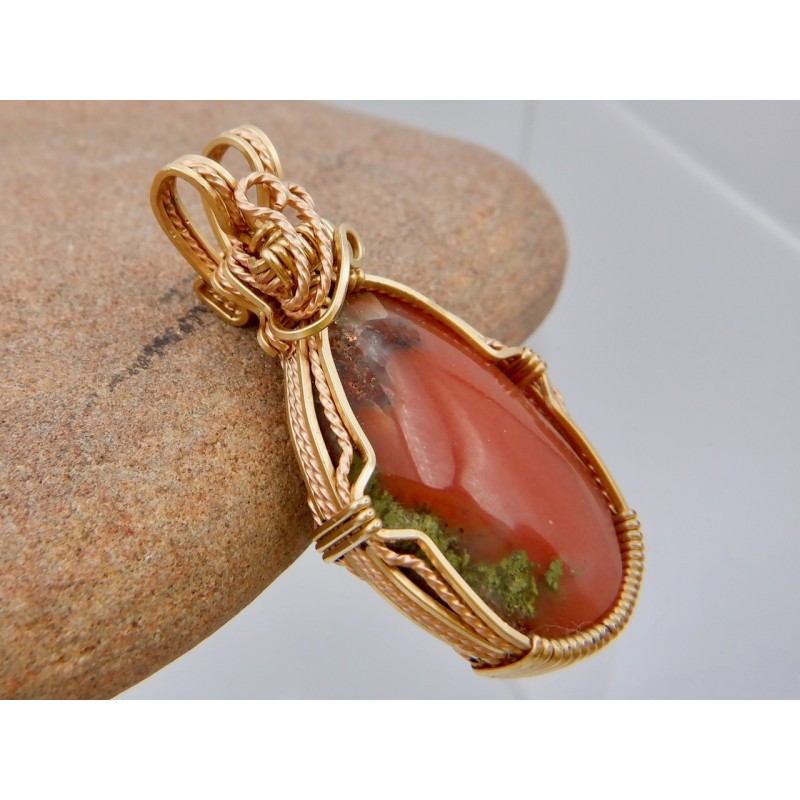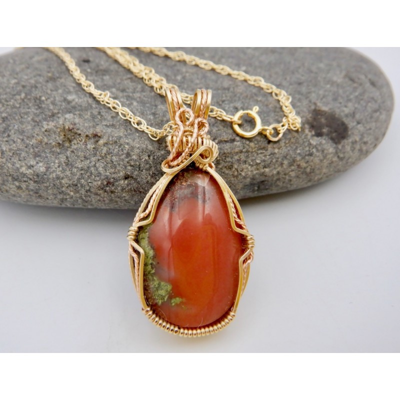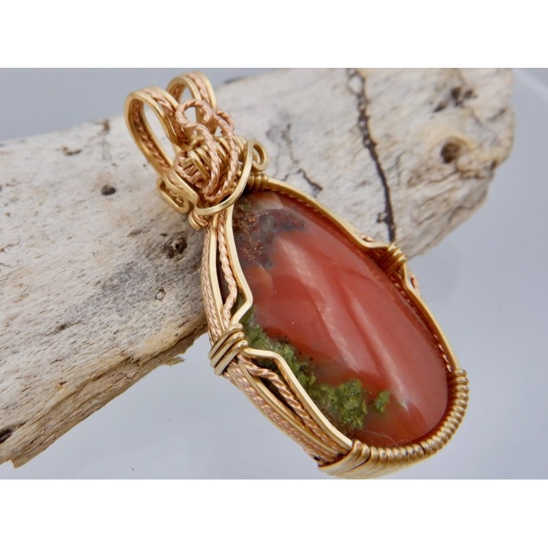 Brilliant red/orange Mesnard Datolite with a bit of Epidote on the edge, this stone has visible roots in the Copper Country, richly colored by the copper. The Double-gold fill wire setting is enriched by interspersing twisted pink, Double Gold fill, gold wires that reflect the copper basie. This is a medium sized stone, one that will please forever!