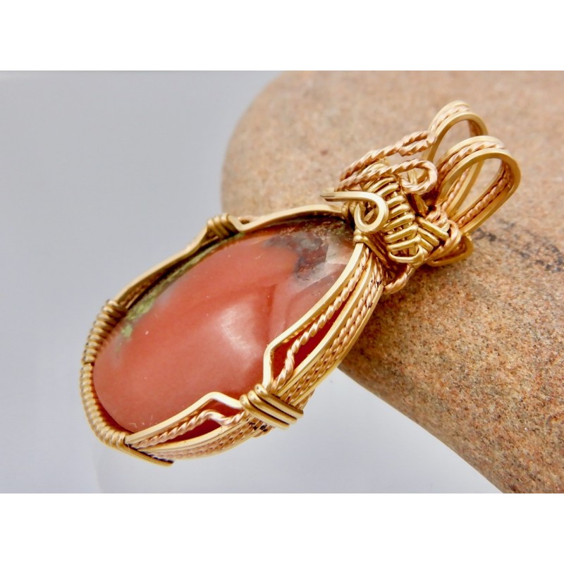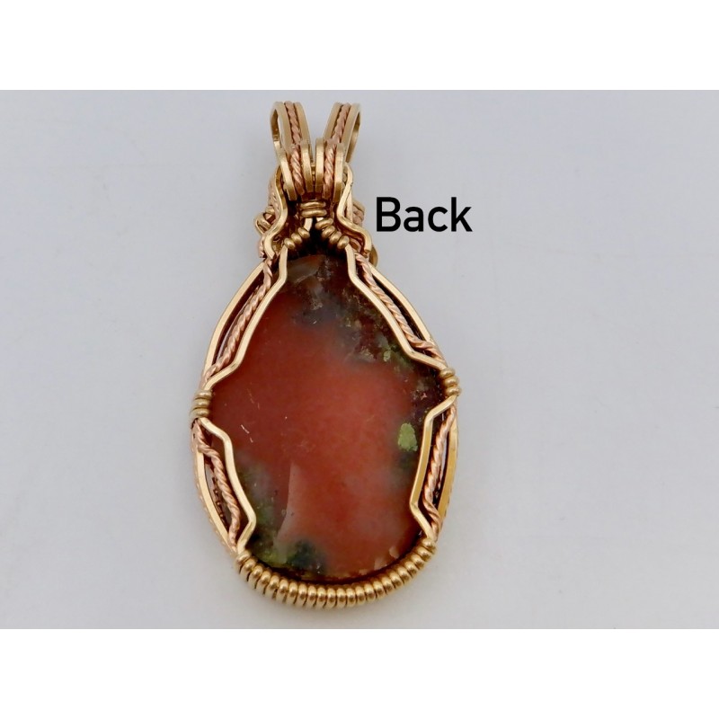 A meticulous wire wrap of 14/20 gold fill and twisted pink gold makes a simple elegant look to this natural stone. Wire work and Lapidary are by Don Reed. These colorful Mesnard Datolites are becoming exceedingly scarce. Something to treasure and wear today, and a great heirloom for future rock lovers. Buy this beauty for your enjoyment today!