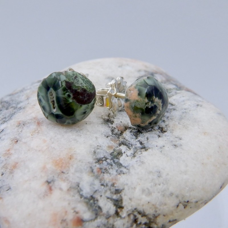 The Isle Royale greenstone is the state gem of Michigan, and is found only in a few locations in the Keweenaw Peninsula and on Isle Royale National Park. a bit of pink, a tiny crystal cave and chatoyance make a these a wonderful gift. The earrings have heirloom value as well since this stone is more rare than diamonds!