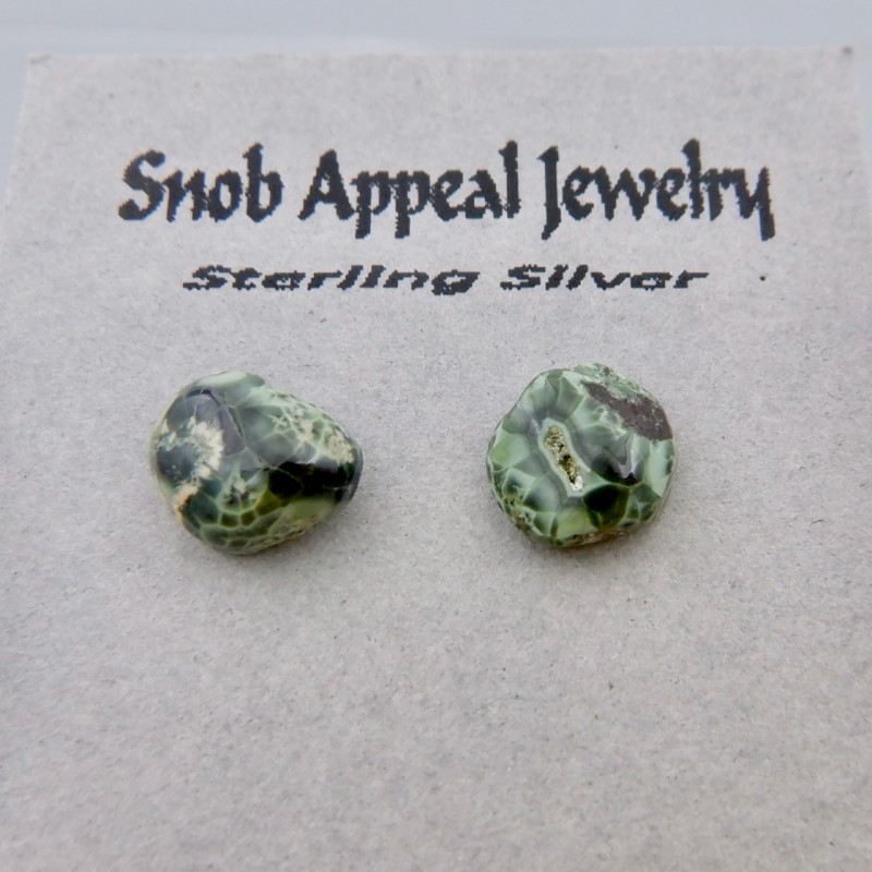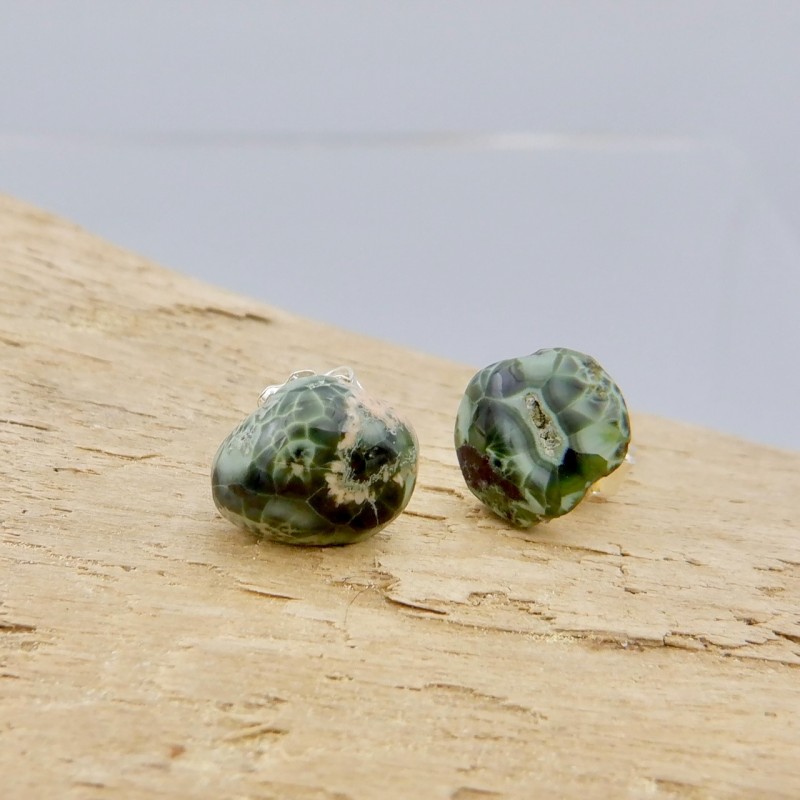 Beautiful Isle Royale Greenstones are set on sterling ear posts. A chatoyant Greenstone pattern covers both stone surfaces. One even has the tiniest little crystal cave.