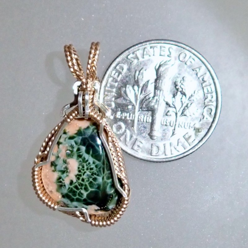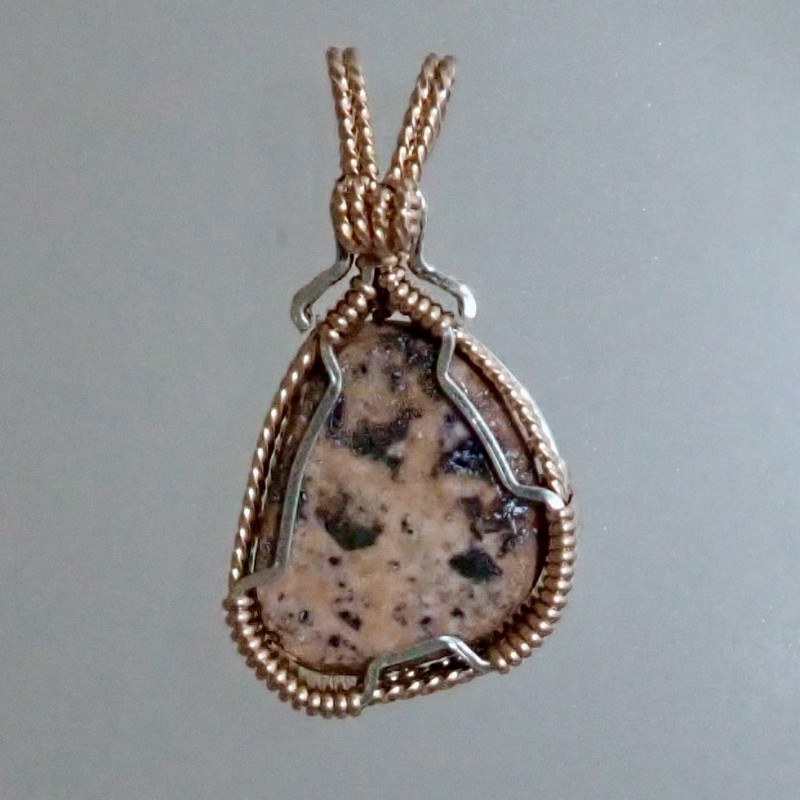 A really nice green and pink Isle Royale greenstone is simply wire wrapped in pink gold with a touch of Argentium wires.