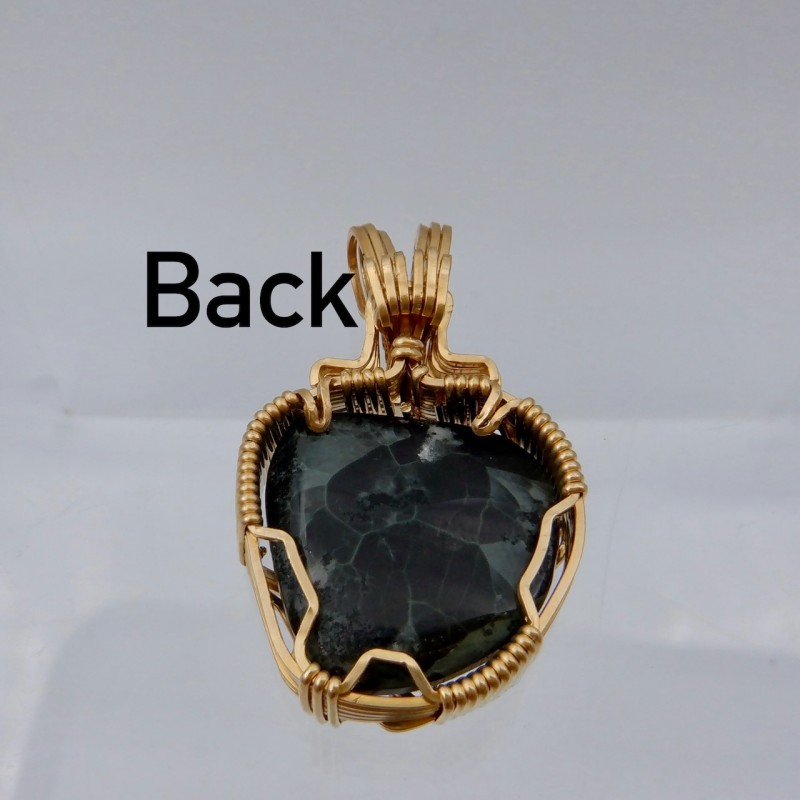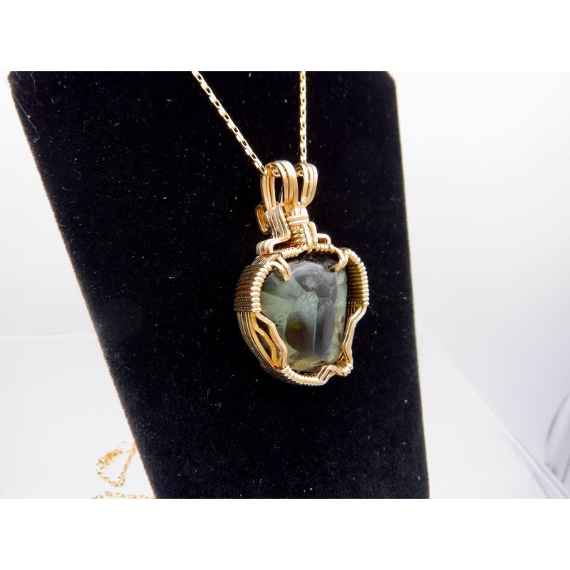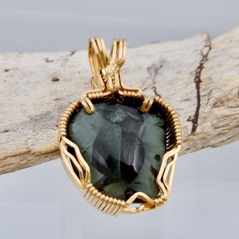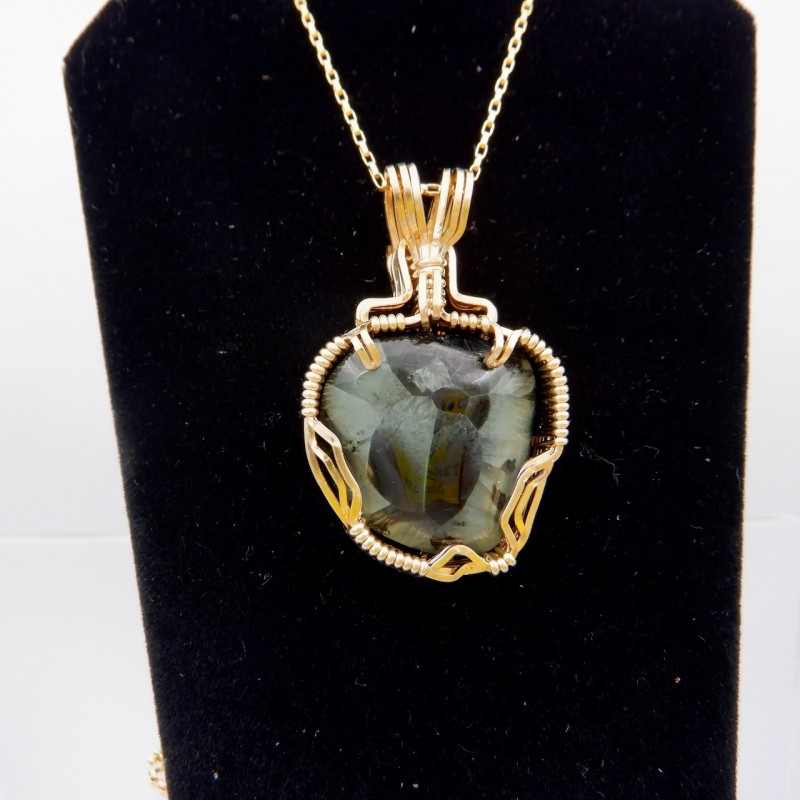 This 4 gram Greenstone with nice chatoyancy makes a top-dog pendant wire wrapped in 14/20 gold fill wires.
