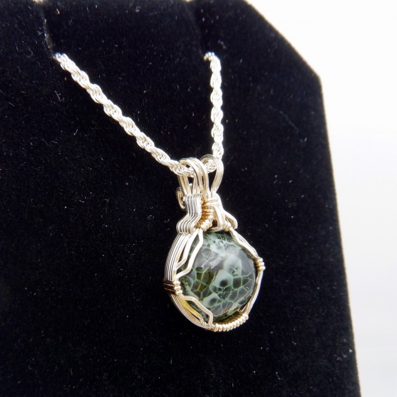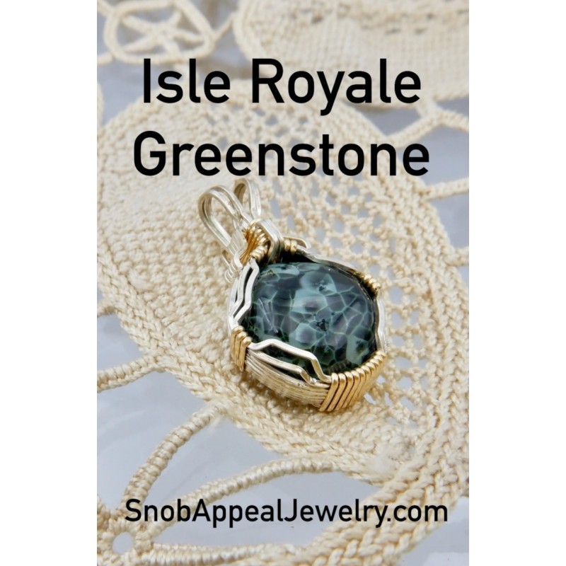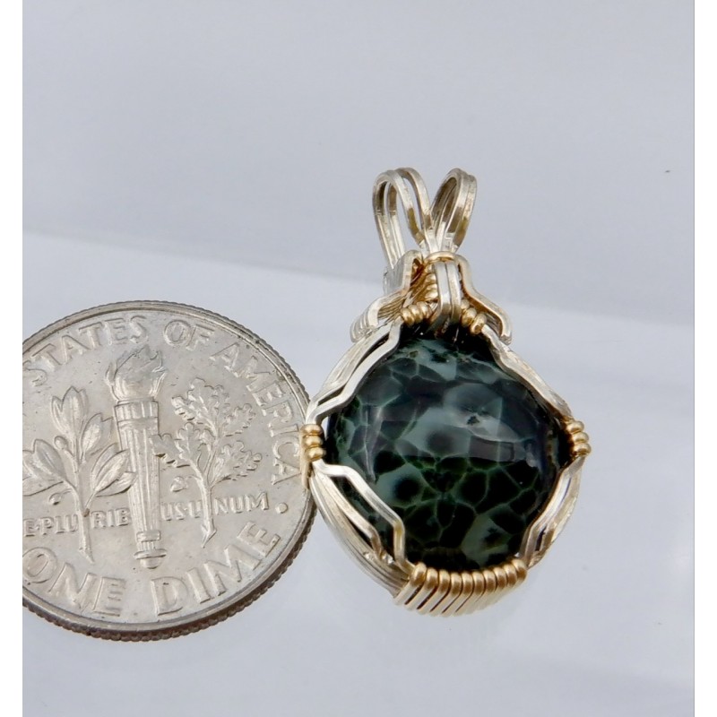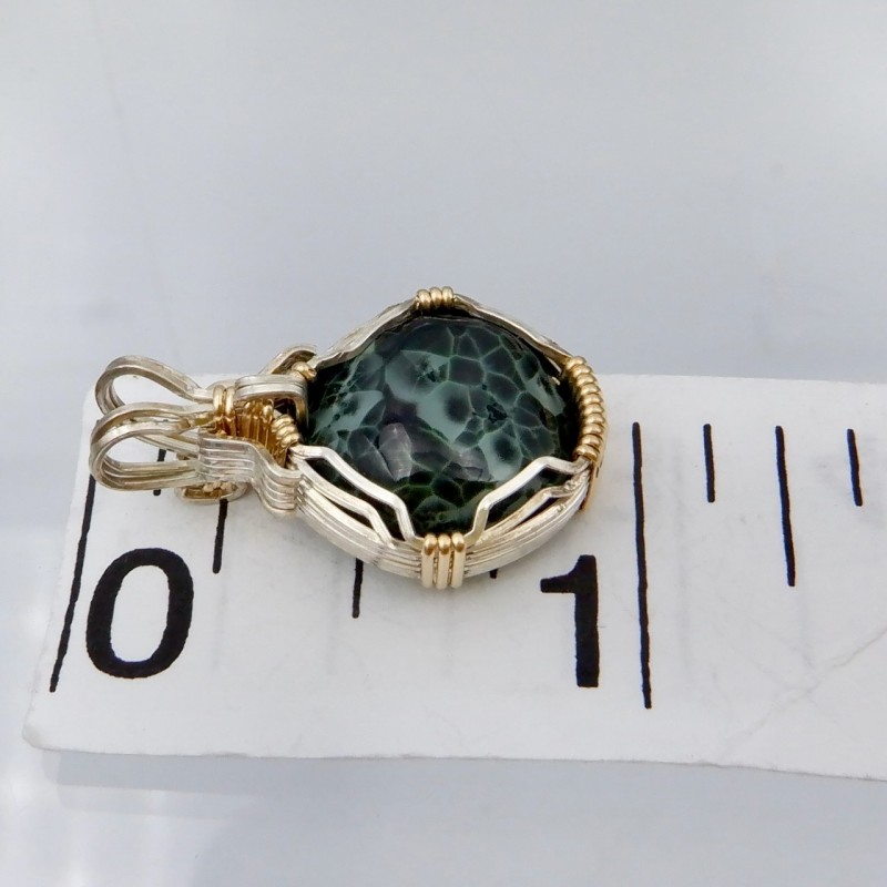 Sometimes a Greenstone pattern is so nice the best way to present it is a simple, elegant wire-wrap. Here is a small 1.2 gram Michigan Greenstone, but big on pizzazz. Wrapped in 24 gauge argentium silver and bound with gold, this can be worn with either color of chain. A gorgeous chlorastrolite pattern shimmers across the whole front.