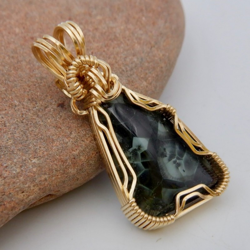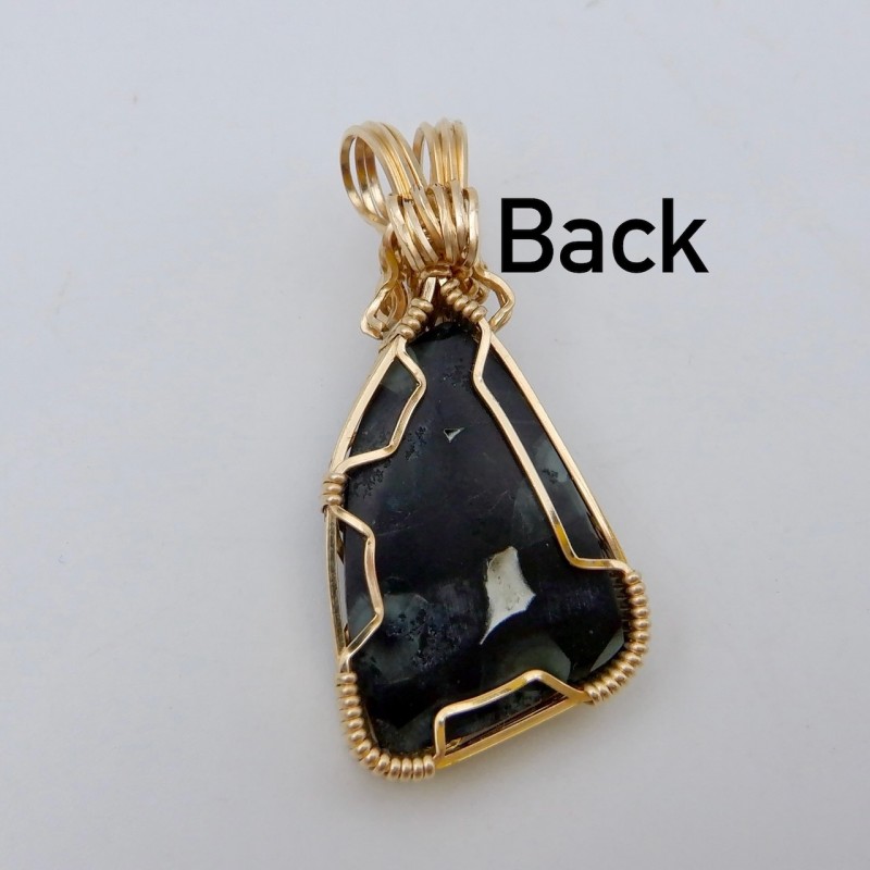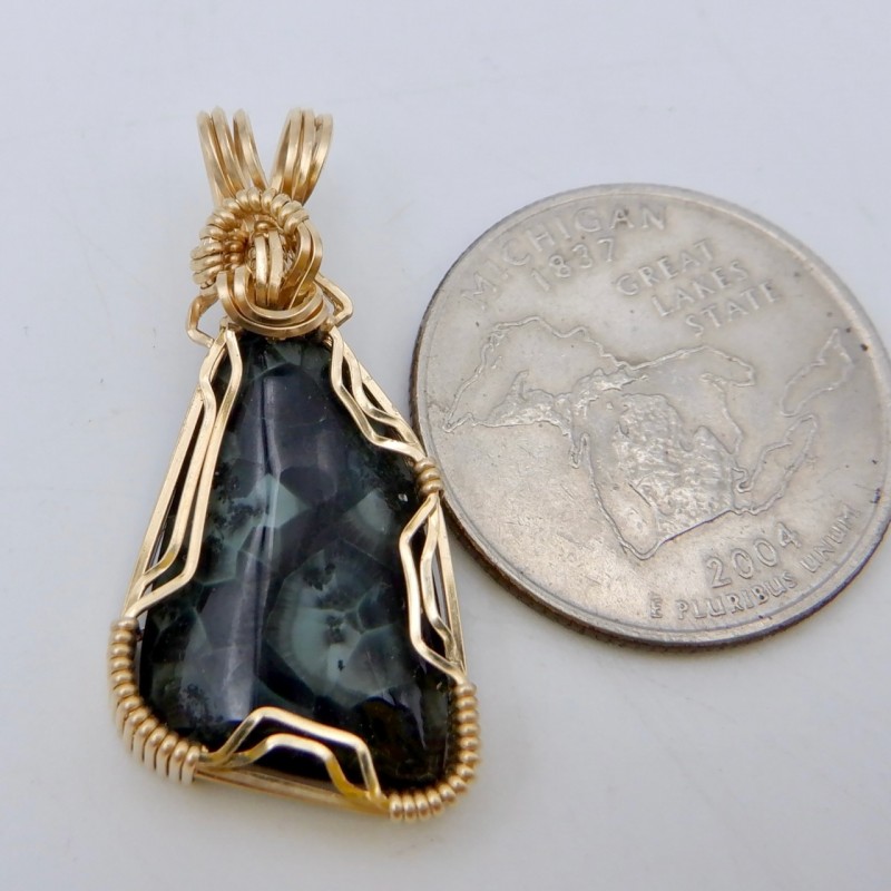 Want a memento from Michigan's Copper Country or our only National Park? This larger Copperland Greenstone is a great example, with chatoyance, and size, wrapped in pretty, elegant gold fill wires. It's everything you need for great memories, and gift-giving.