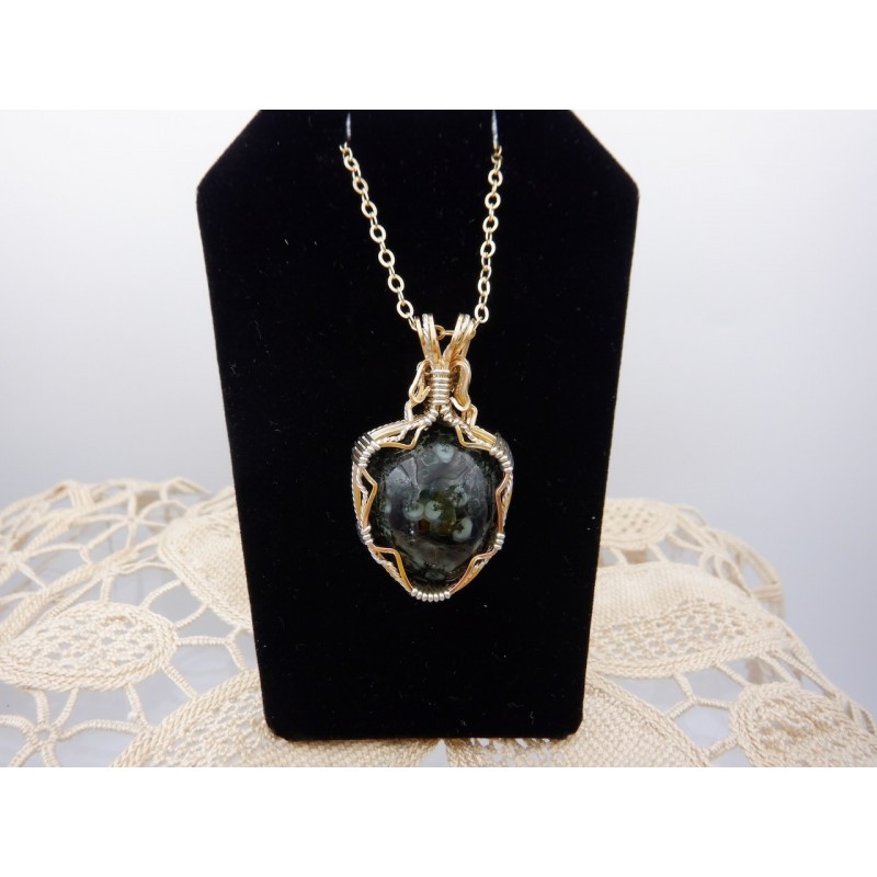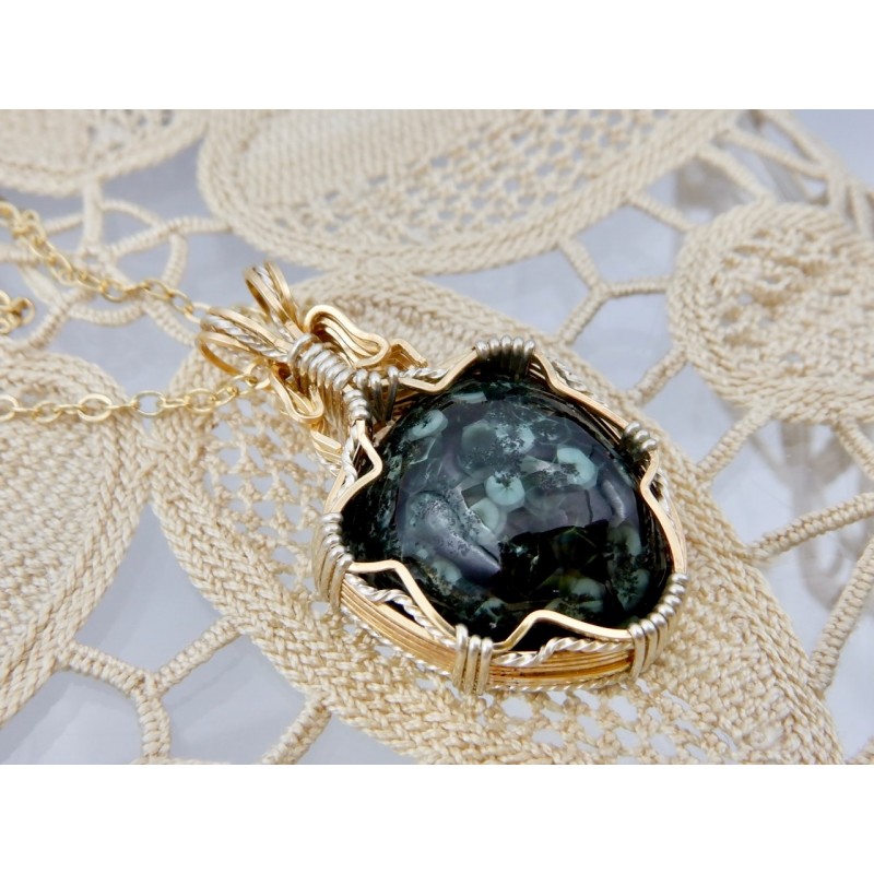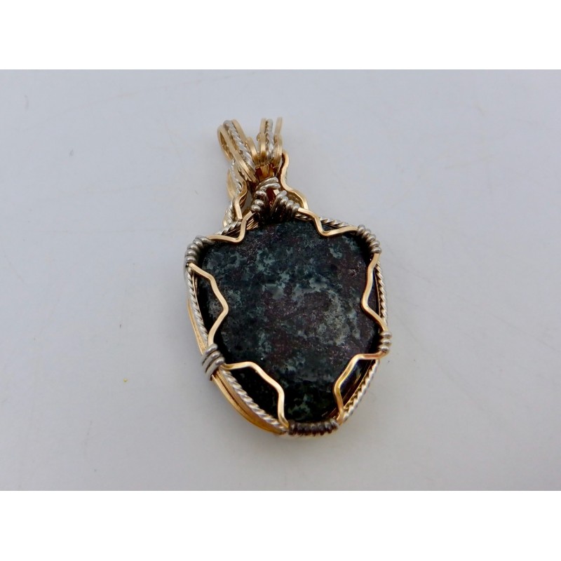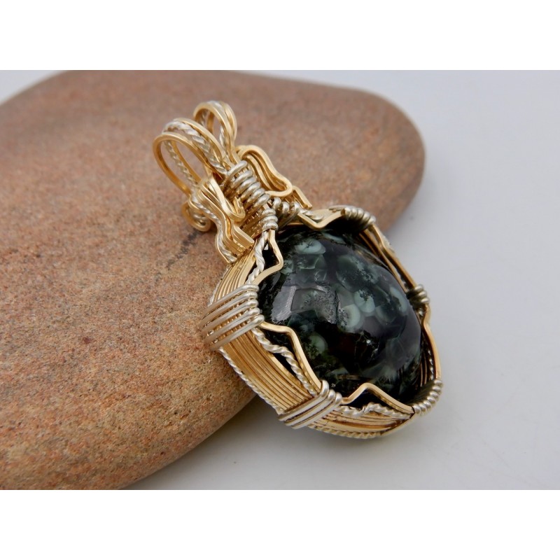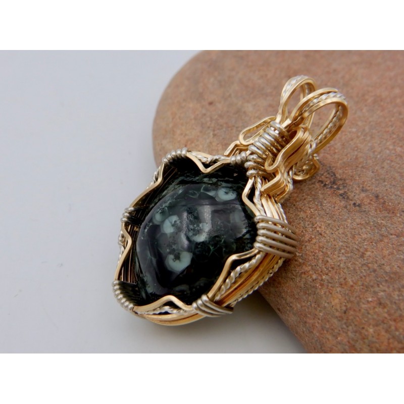 This stone probably came from the Central or Phoenix mine some years ago and recently came to the surface in our shop. The Wire work is a combination of Argentium silver which has been hand twisted to add decoration, and Gold fill. The effect is very elegant, on a lovely stone.