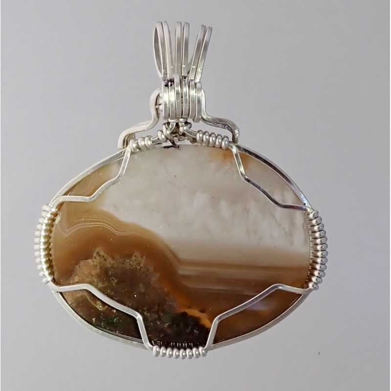 Icy crystal over earthy water level gate stripes created this scenic stone. Don wire wrapped it in Argentium silver wires, creating a unique pendant for you to enjoy! A Lake Superior agate picture stone for you to wear--so unusual! Tell your friends about the glaciers of long ago--go ahead, be a stone nerd!