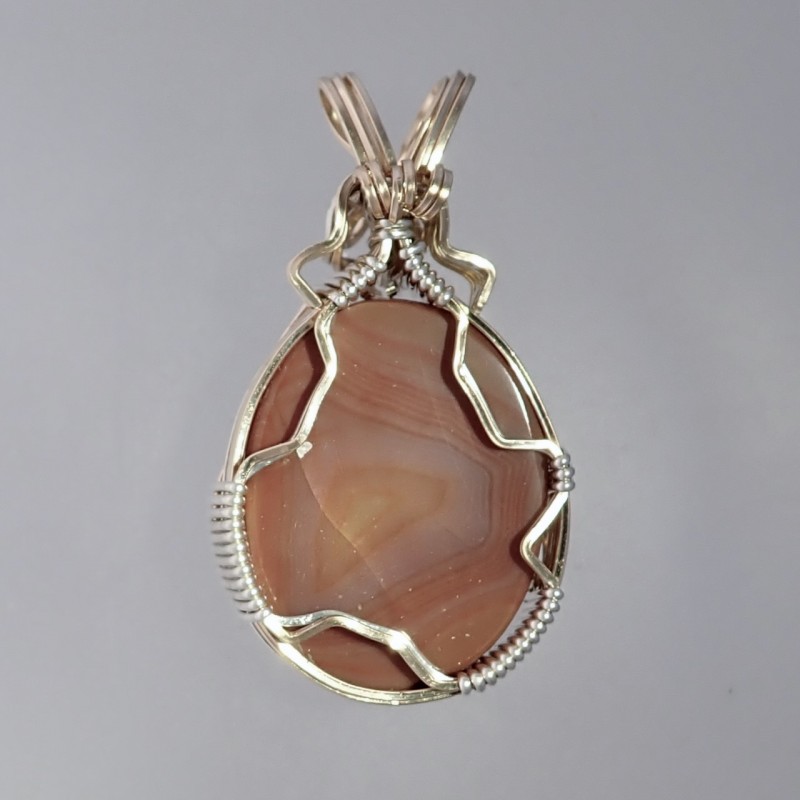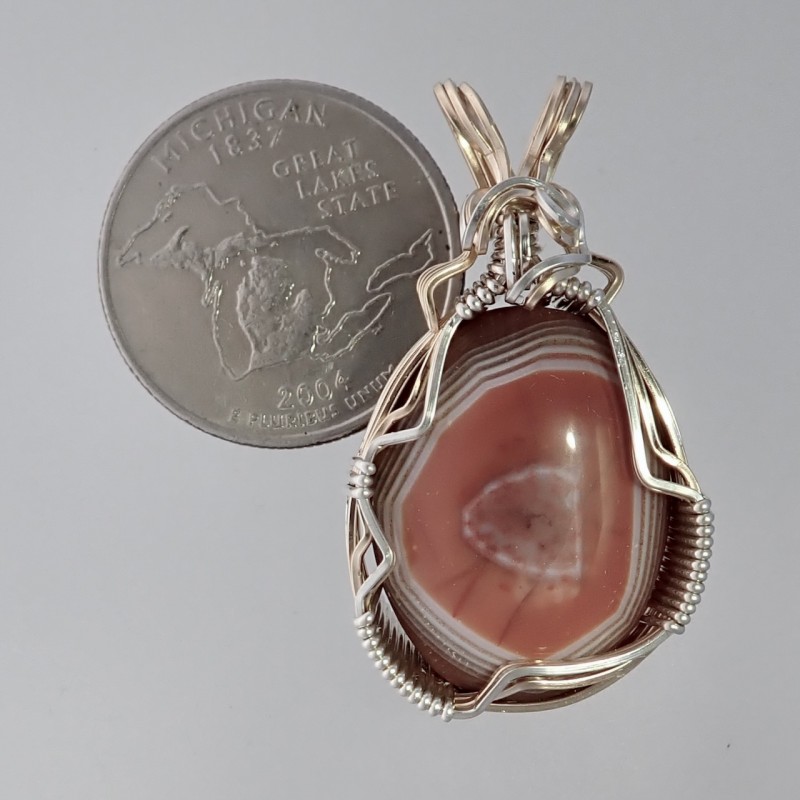 Imagine the brightest Orange/red/pink Lake Superior agate with a pink crystal center, completely surrounded by narrow white bands, there you have this unusual stone. This is a Flamboyant color for sure, and no-one will have one like it! Wire setting is gold fill and Argentium silver combined beautifully together.