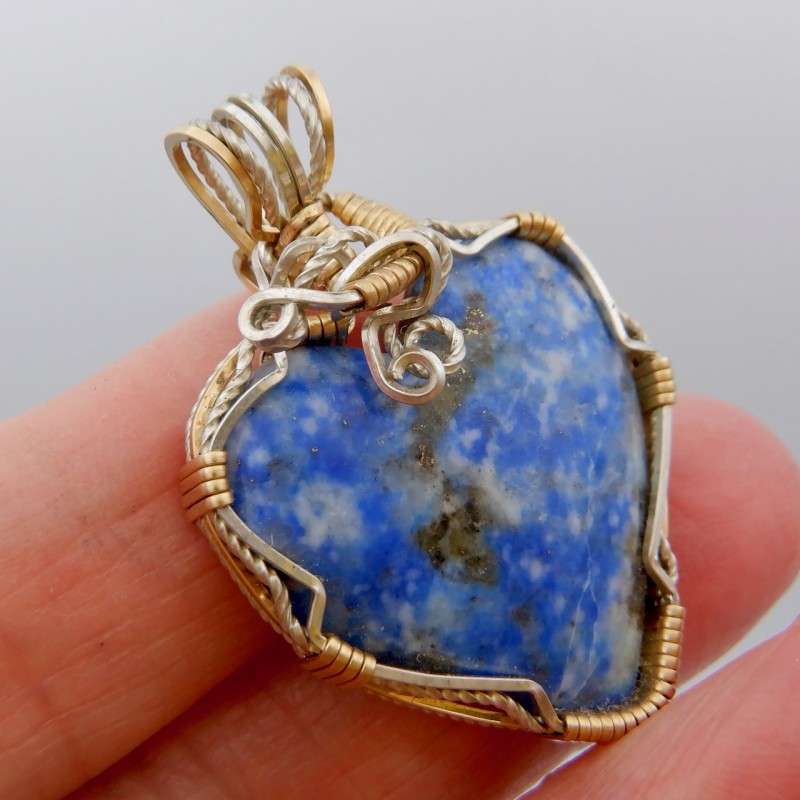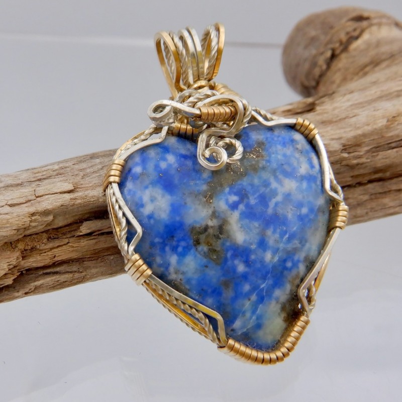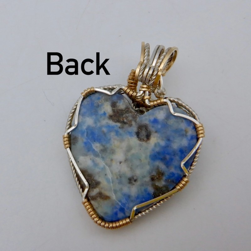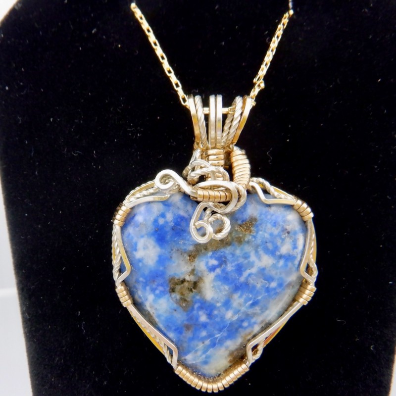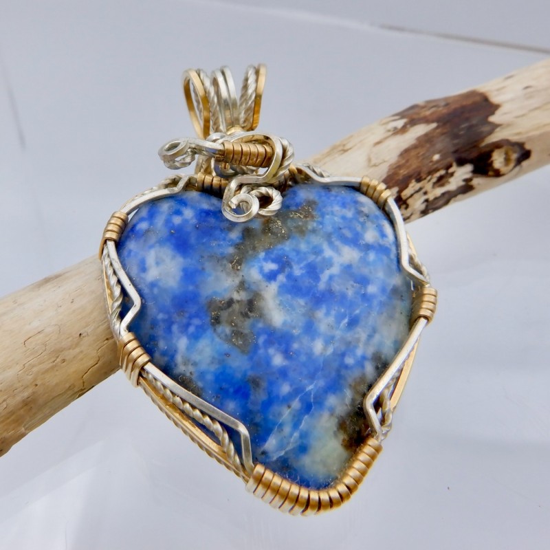 This is a heart-shaped denim lapis delicately wrapped in 14/20 gold fill and argentium wires. A wonderful balance of lazurite, calcite, and pyrite are apparent in the gemstone. You can wear denim lapis with your casual blue jeans or your fancy white dress, it is very versatile. Hearts are always a popular shape, and this hand crafted jewelry would make an excellent gift for yourself or someone you love.