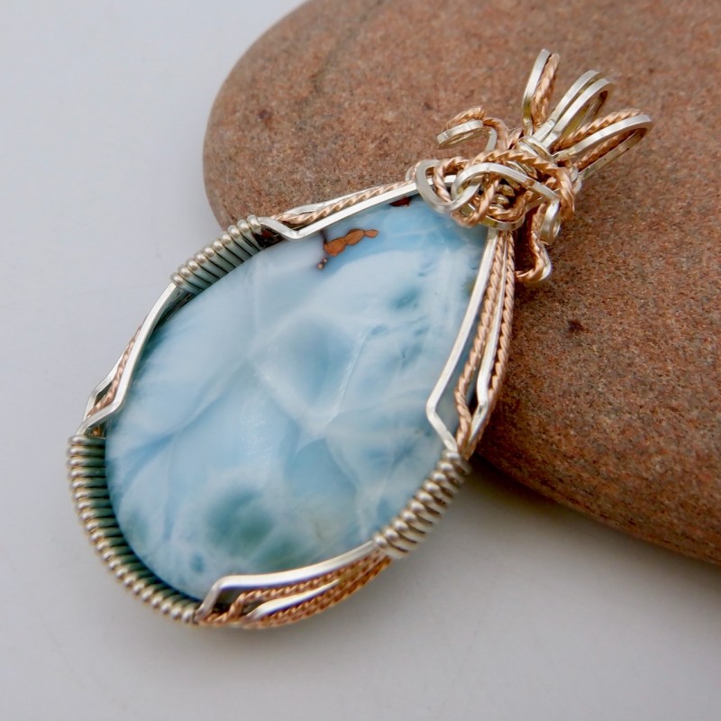 Pastel swirls of blue tones swim across the surface of this island stone. It is perfectly cut and wire wrapped in tarnish-resistant argentium silver alternated with ropes of twisted pink gold wires, creating a stunning, elegant setting with small decorative swirls at the top. The little island of copper is enhanced by the pink gold and makes a special inclusion, a touch of handcrafting rarely seen in the jewelry of the larger industry. This pretty Copper Surprise Larimar Pendant makes a wonderful gift.