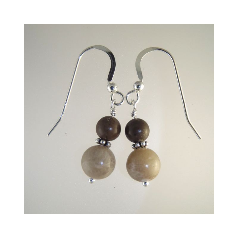 Two Petoskey stone beads hang on silver head pins from silver ear wires. The Petoskey stone is the state stone of Michigan, and is found primarily in the northern lower peninsula (where we live). One of these beads is darker in color than the other, indicating the presence of oil when the stone formed. A sterling spacer separates them. 1 1/4"