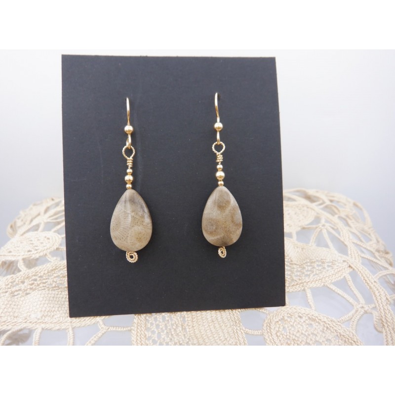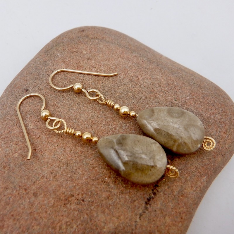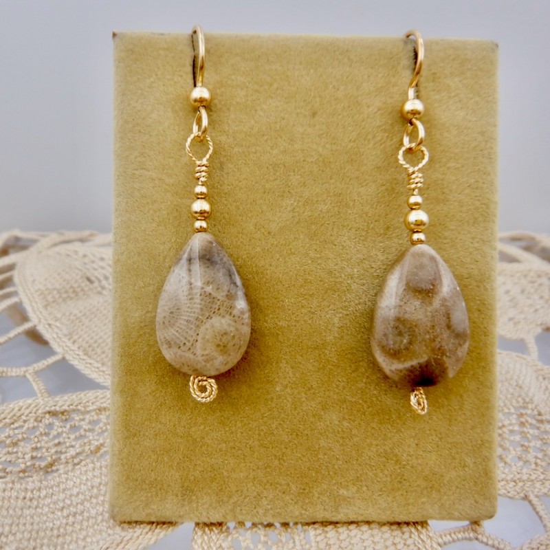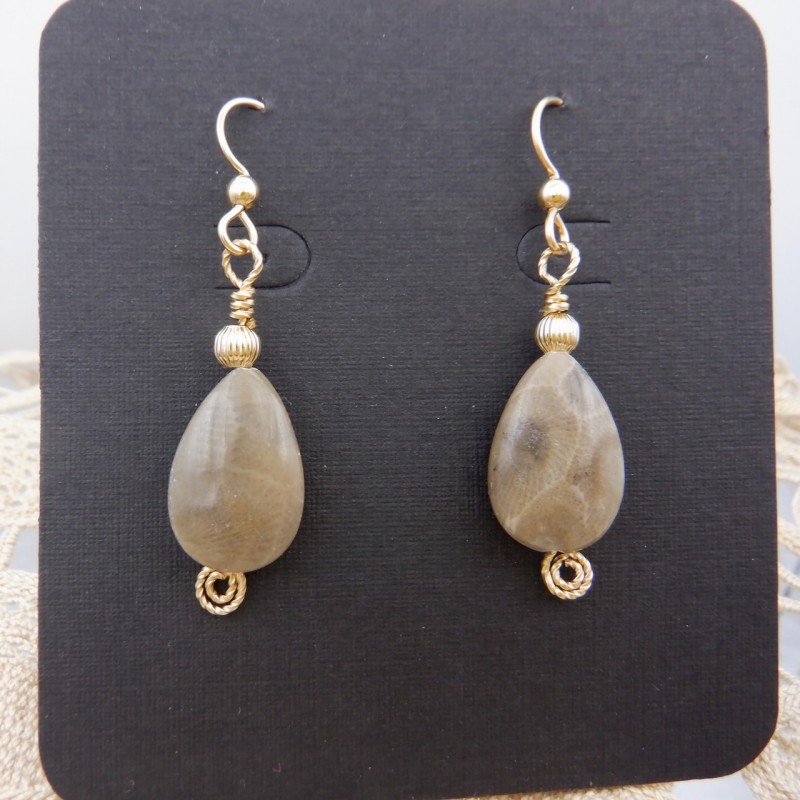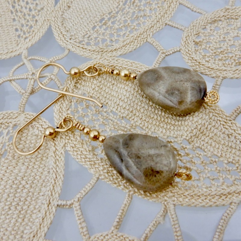 Teardrop Petoskey Stone beads are accented with metal beads at the top and balanced on the bottom with twisted wires in a small spiral. Gold fill Ear wires are our best fishhook wires, for a long life!