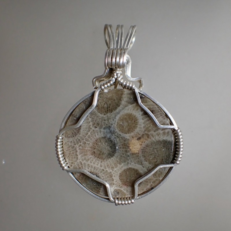 Argentium wires surround the stone with no-frills square wires, making the Petoskey Stone very secure, well protected and stately. The back is also hexagonal fossil images.