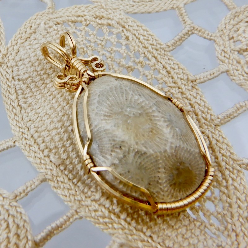 This is one of the smallest Petoskey stones Don has done, wrapped in gold fill. If you are looking for petite jewelry big enough to showcase the really nice hexagon shapes, buy this little pendant!