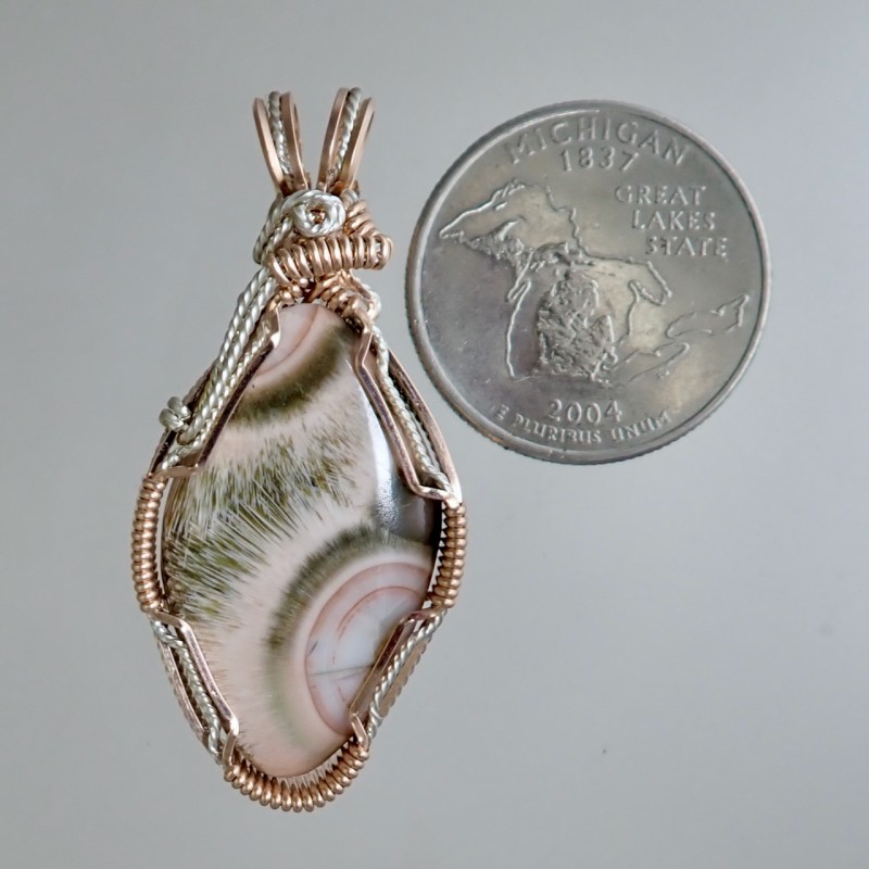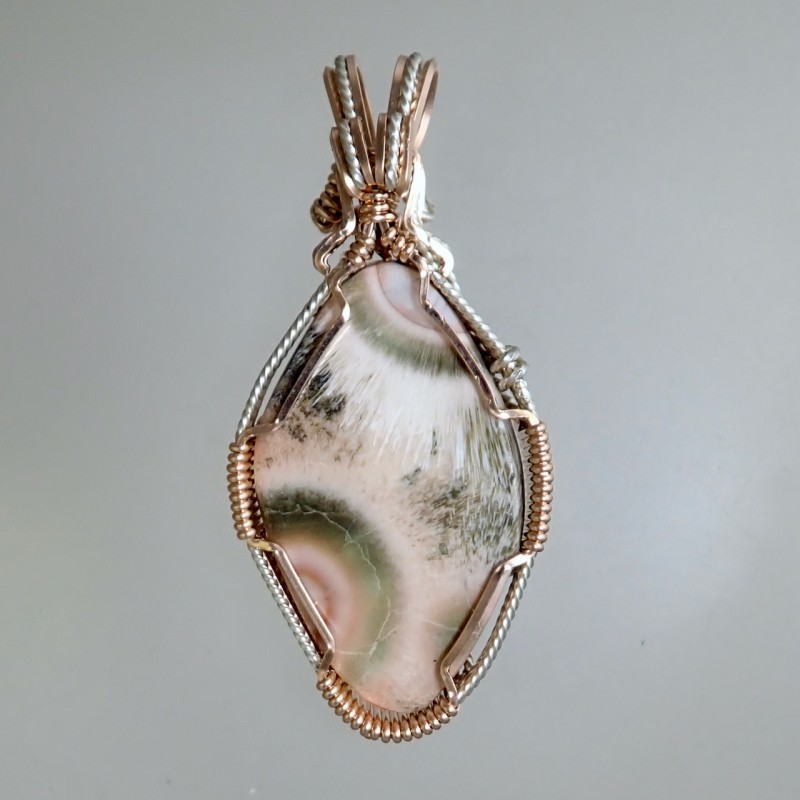 The pendant design enhances this light salmon-pink Thomsonite, with its large eyes surrounded by needlelike dark structures. The pink gold and argentium silver bring out the best in this designer piece, bringing out the stone to it's best. The striking designer wrap showcasing this North Shore Thomsonite from Minnesota.