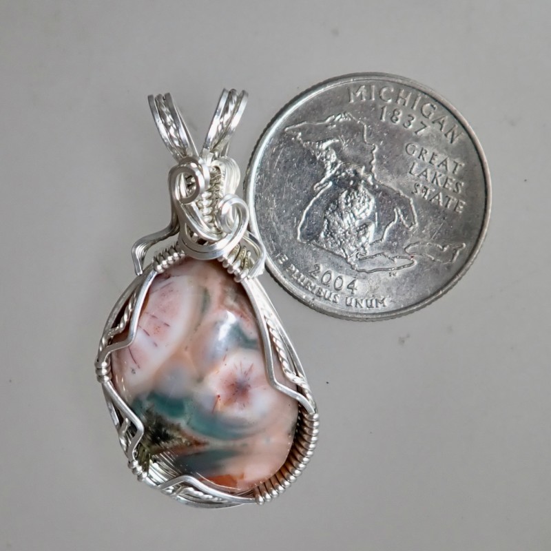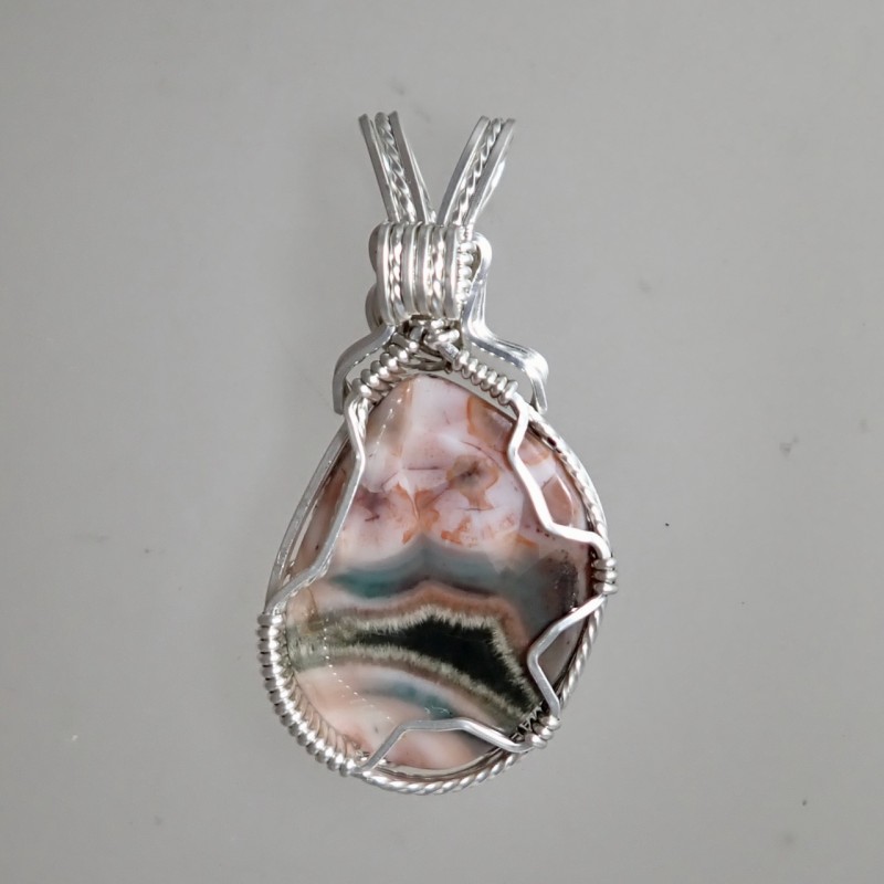 Each Thomsonite from the shores of Lake Superior has a unique vibe. You'll love the blue-gray storm on the bottom with an almost agate looking formation in it, with the great pink colors, and the island-like eye. The all silver wire work has twisted wire hugging the stone, and the swirls at the top are graceful and I like them! The wire is tarnish-resistant Argentium silver for long life.