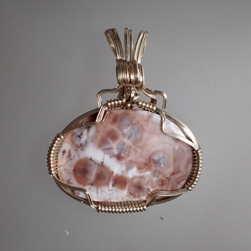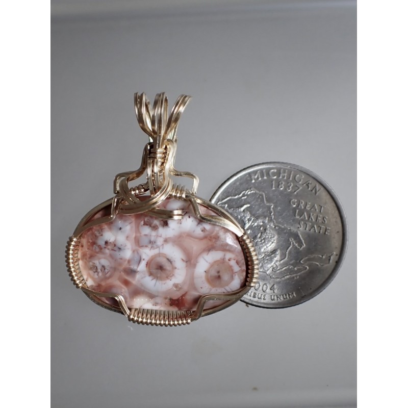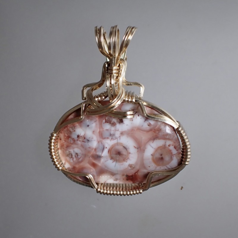 From the North Shore of Lake Superior comes this lively pink and salmon Thomsonite. Treasured by rock hunters, Thomsonite is hard to find these days. This beauty is enhanced by layers of square gold wires creating a fancy setting. You'll love showing off this piece!