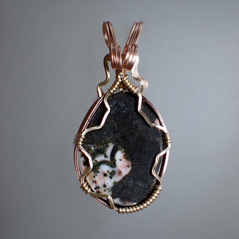 Mysterious and dark, Thomsonite like this is not common! It's got darkness, and pink, and a sassy eye that sticks out. Wire setting is a mix of pink gold and yellow gold fill, very elegant.
