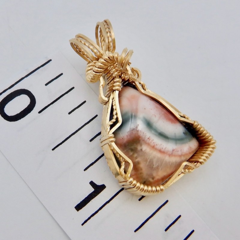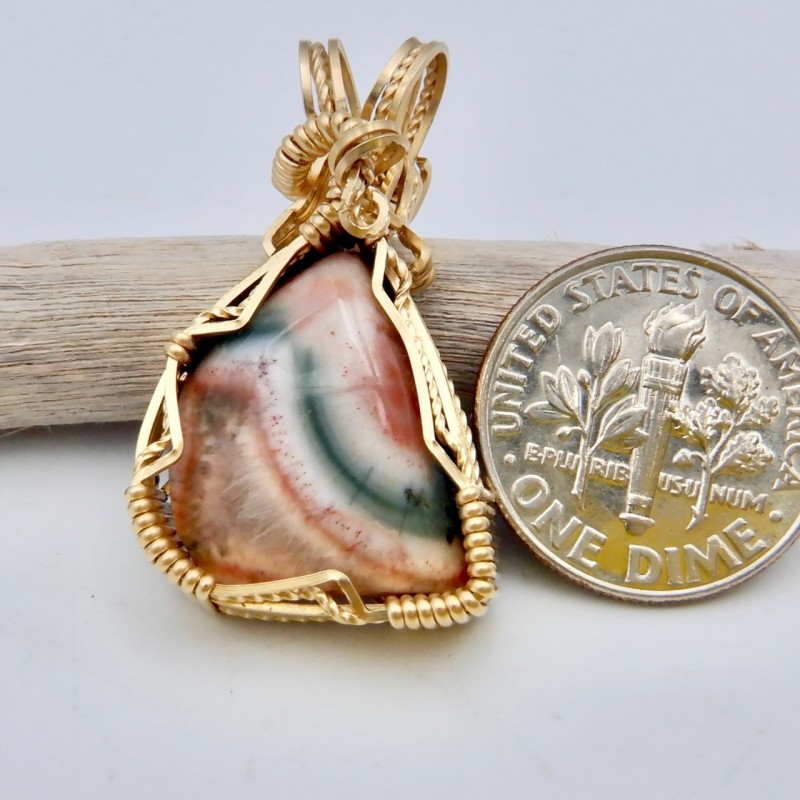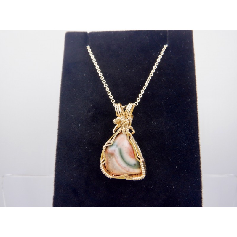 This Flaunting Thomsonite is a gorgeous and classic Thomsonite from the long-closed location on the North Shore of Lake Superior near Grand Marais, Minnesota. Ribbons of green and shades of pink flow through this perfect Thomsonite, making it a prime example of the way Thomsonites can look. This piece was made from recently acquired old material, meaning there are not a lot of stones like this. The pendant is entirely 14/20 rolled gold (24 gauge) wires. Flaunt it, baby--buy and wear now!
