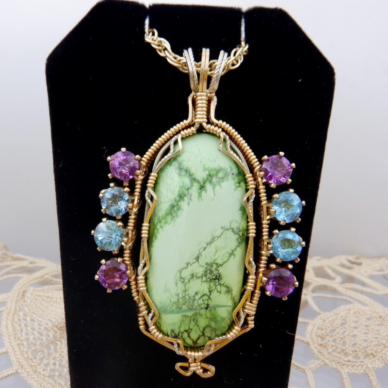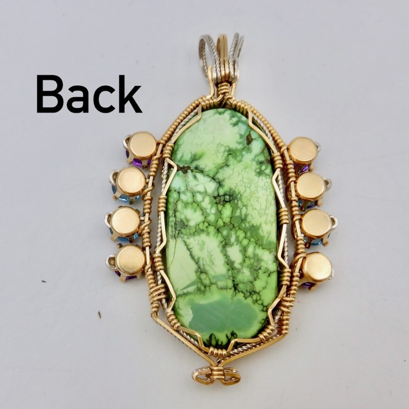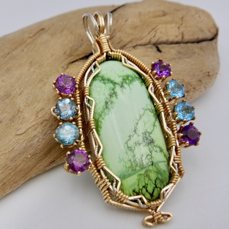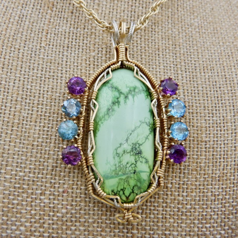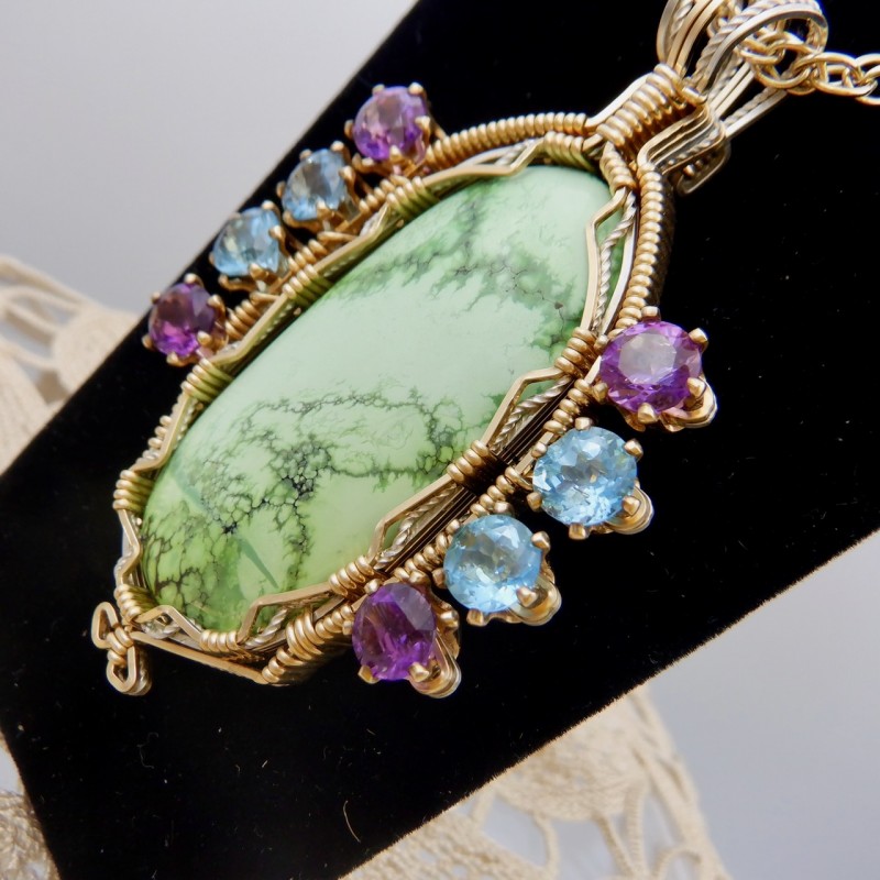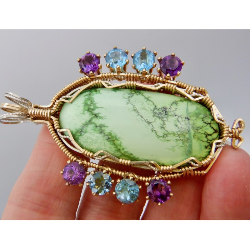 Variscite like this is hard to find. A complex wire wrapping combines faceted gems and a super variscite cabochon in a striking piece. Four 6 mm faceted dark amethyst and four sky blue topaz line the sides of a beautiful variscite to dazzle the eye. The wire is primarily gold fill with a hint of silver. Variscite is from Utah, but this is unusually nice coloring.
