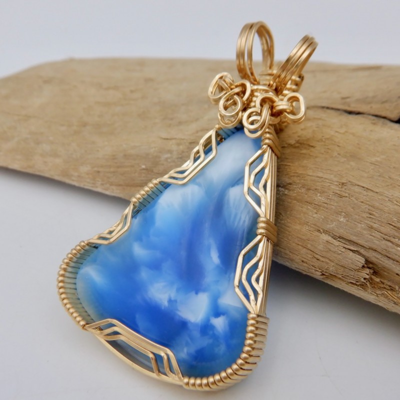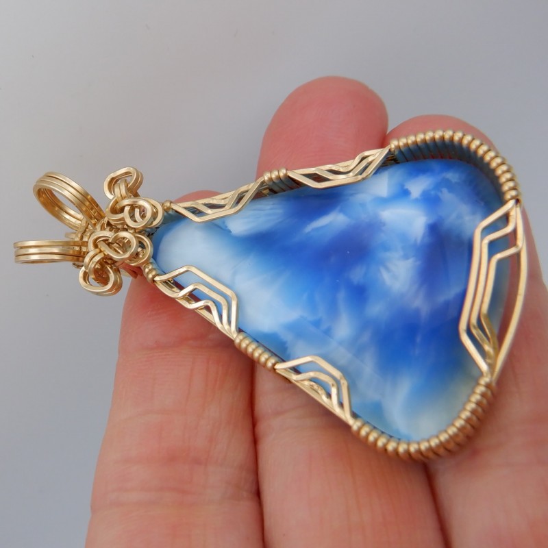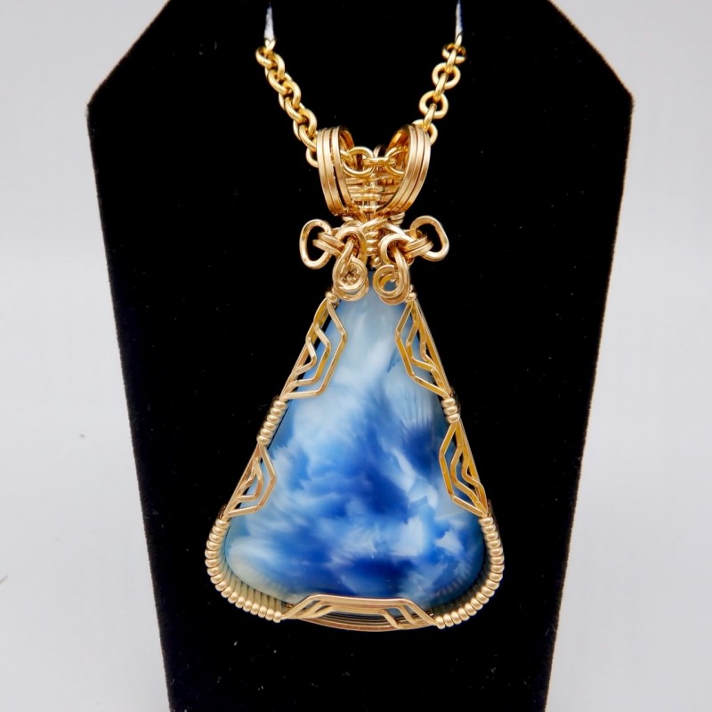 A beautiful bright blue triangle of Victoria Stone shines in a lacy hand crafted 14/20 gold fill wire jewelry setting. This is a premium example of chatoyant rich blue Victoria Stone, very eye catching, and a top-selling color.