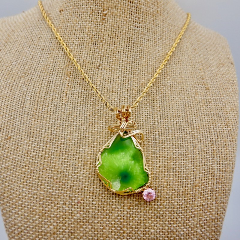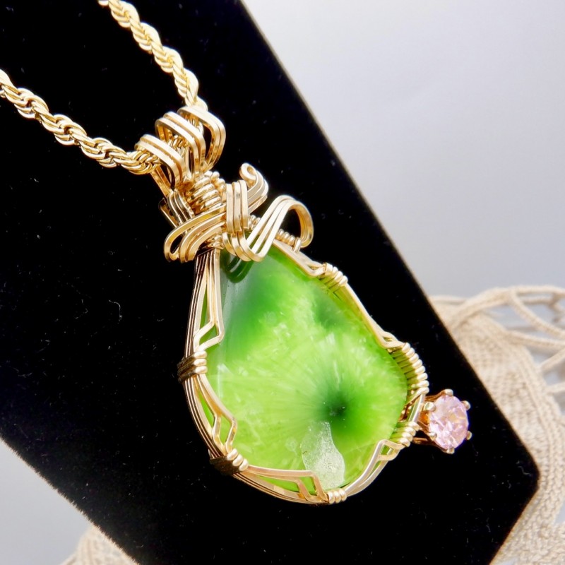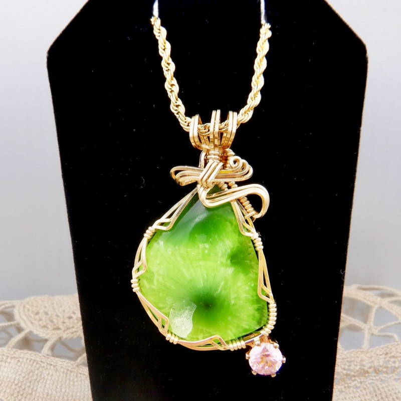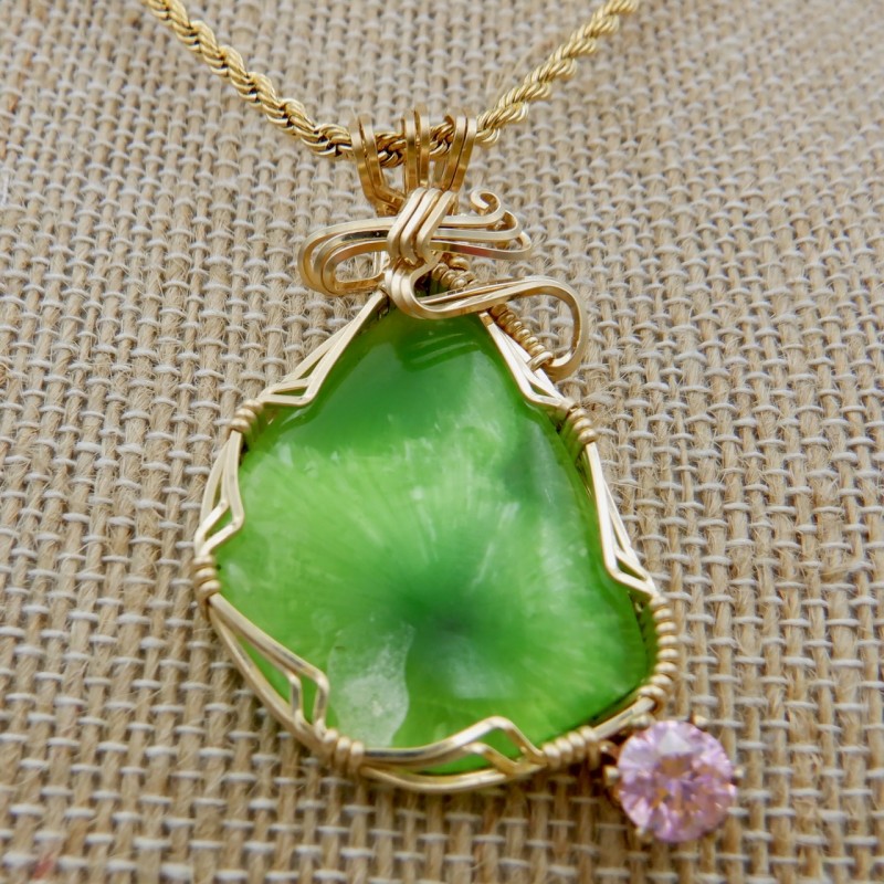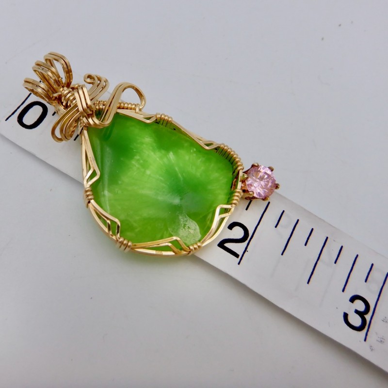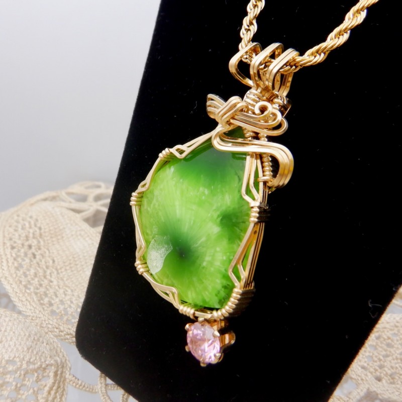 A fluorescent vibrant yellow-green Victoria Stone enhanced with a 6mm pink cubic zirconia, this is a great example of this long-extinct man-made stone from Japan. Extremely difficult to find material, this material is one of my favorite jewelry stones. In our booth, Victoria Stone is always an eye-catcher. Artificial jade-like in nature, the chatoyant play of colors across the face of this stone is exceptional. As you move, the color dances across the stone. This hand crafted stone jewelry is wrapped entirely in 14/20 gold fill wires with a flowing top design.