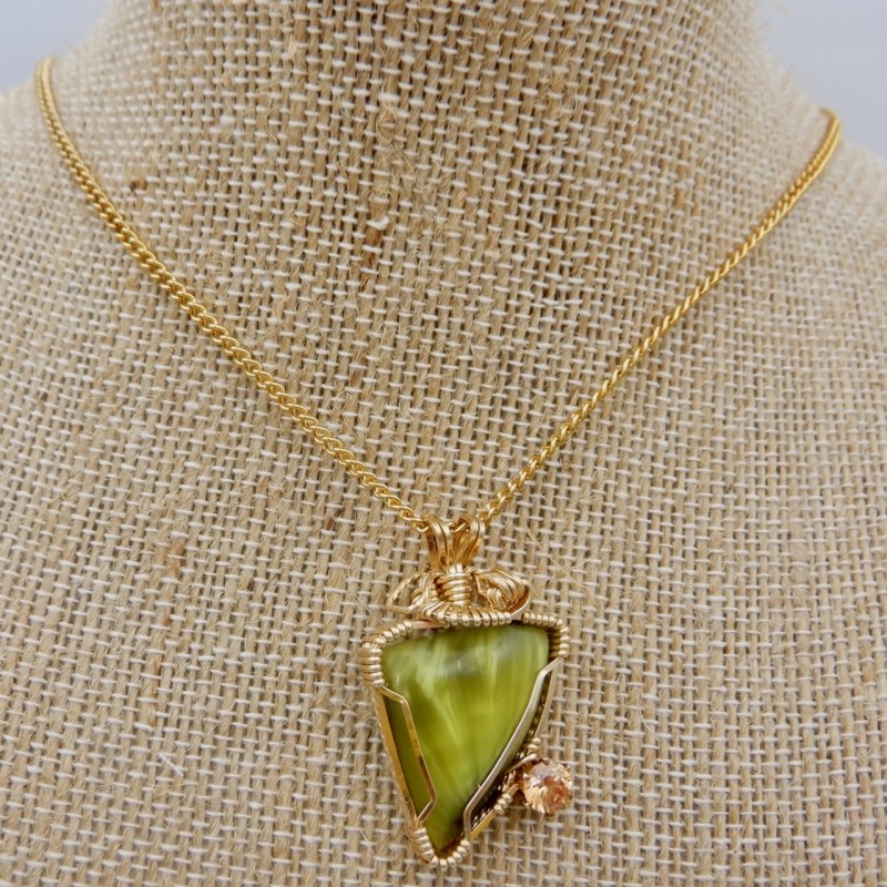 RARE! A very chatoyant and flashy pendant. The designer-cut lime green Victoria Stone is enhanced with a champagne CZ, WOW! Sometimes the right combination just makes you happy! Wearing this hand crafted stone jewelry will get you noticed for sure. The 14/20 gold fill wire wrap is intentionally simple. With a stone this nice you don’t need much. Rare and lovely, checkout today!