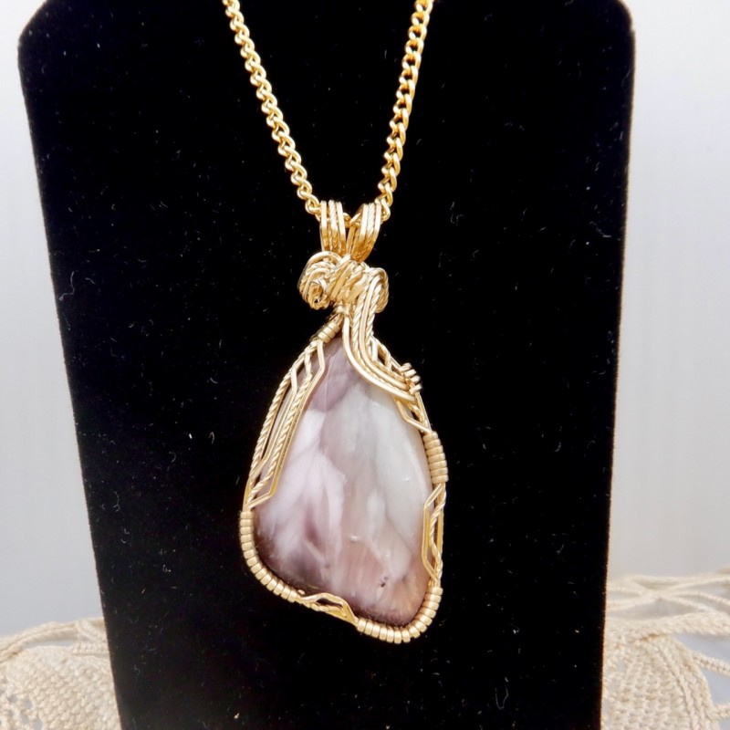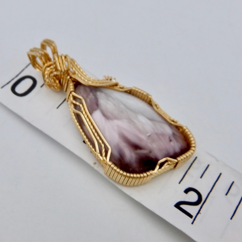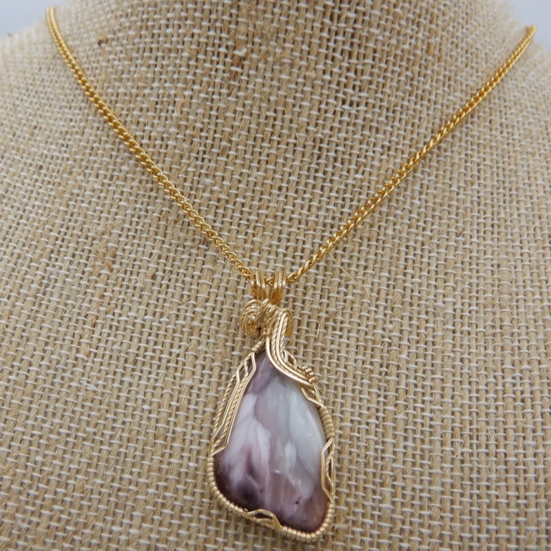 Chatoyant white leaps from this wine colored wire wrapped Victoria Stone. The gold fill wires are twisted for maximum elegance and bling. This pendant paves the way for loads of complements. Not overwhelming in size, but fabulous with Snob Appeal, this piece of jewelry flashes with class.