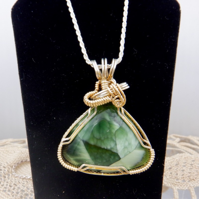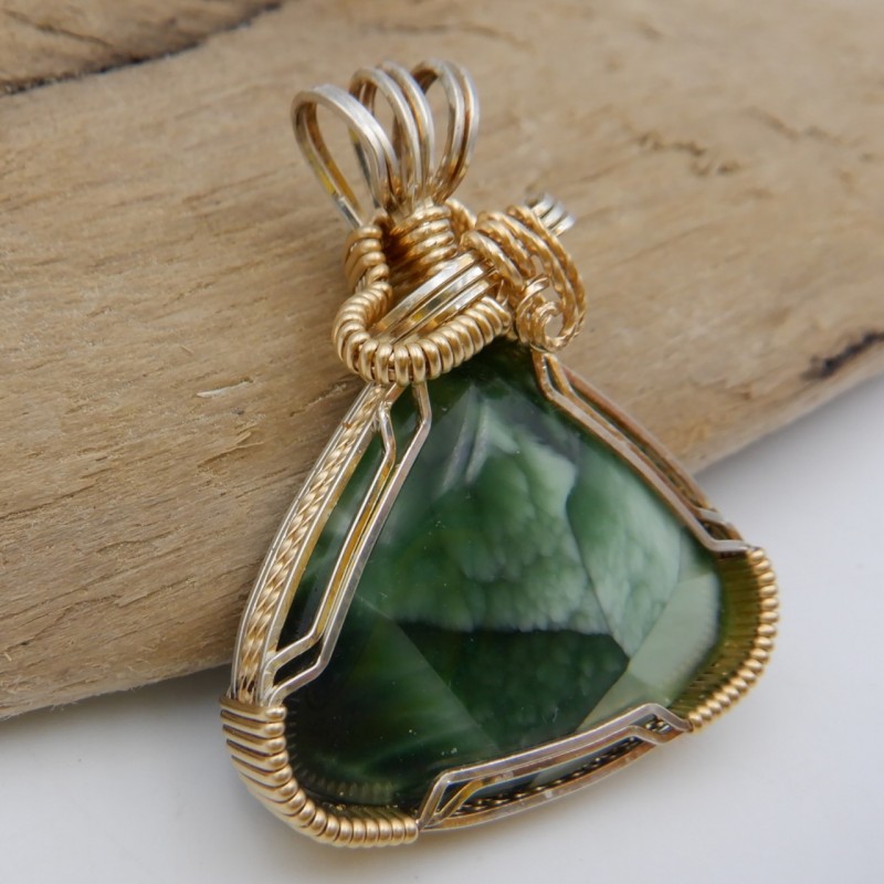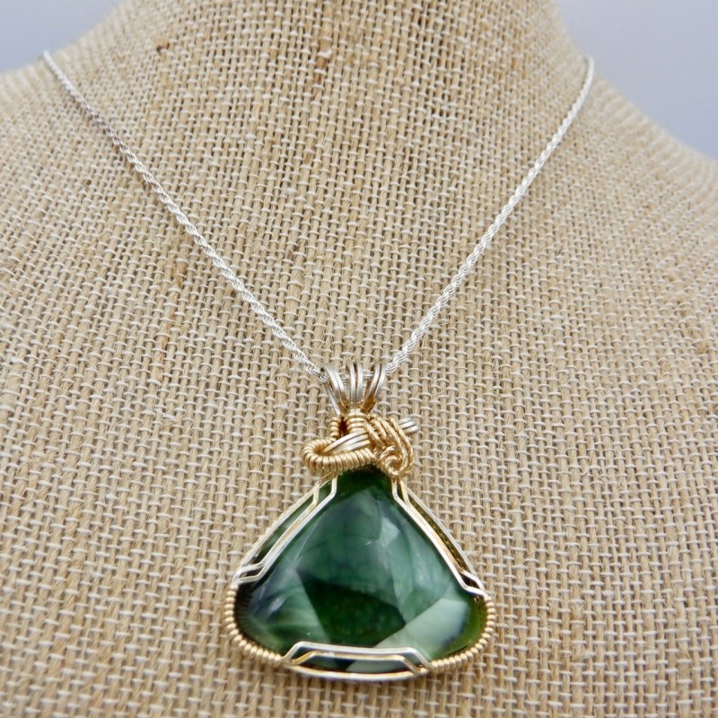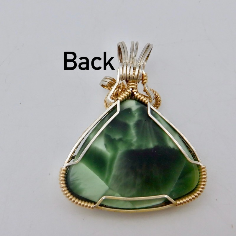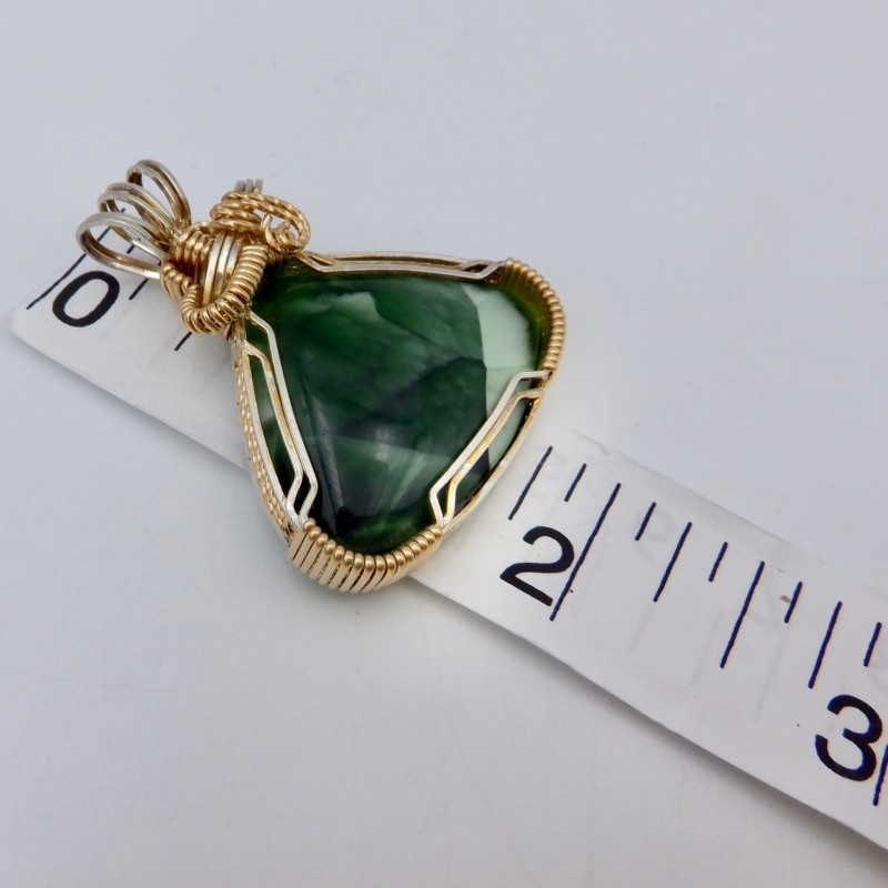Medium green with lighter green color-changing sections animate this distinguished designer-cut wired wrapped pendant. You will not be able to take your eyes off this luscious spruce green gem. When this gem adorns your body you will feel like a queen. A perfect and elegant wire wrapping enhances the stone adding to its appeal.