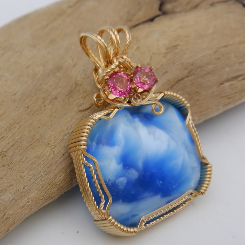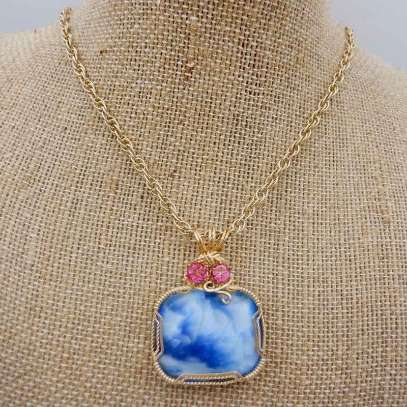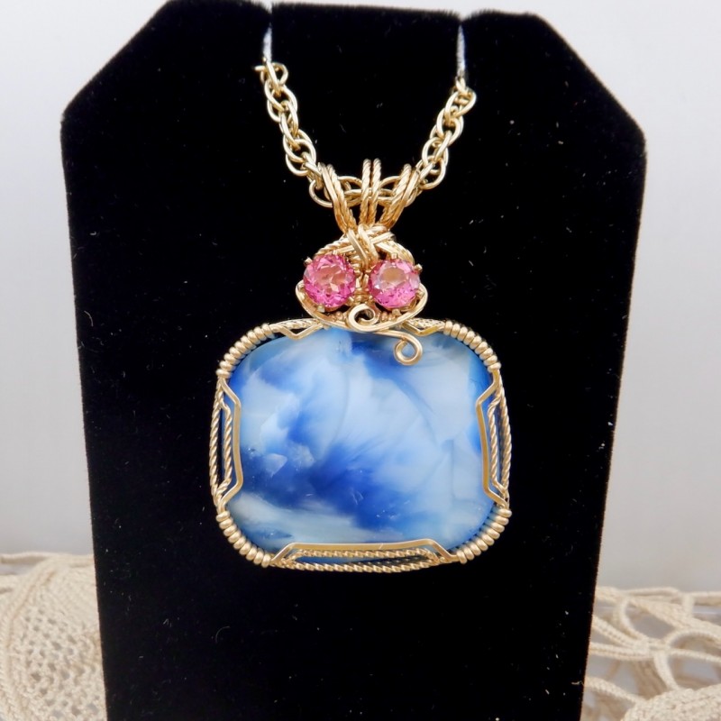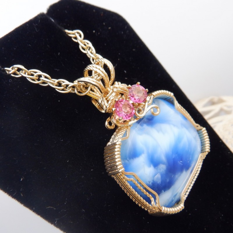 Pulses of blue chatoyancy dance throughout this gorgeous light blue Victoria Stone. The elegance of this stone is enhanced by a pair of Pink Topaz. Wrapped in 14/20 rolled gold, this pendant exudes style. You will be noticed from across any room wearing a pendant like this one. Snob Appeal Jewelry is the only place on the web you can find wire-enhanced Victoria Stone like this most-popular light blue beauty.